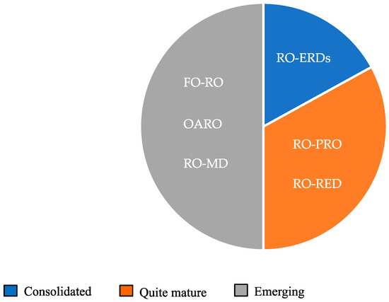 Figure 20 summarizes the degree of development of the different integrated RO systems reported and discussed in this work. It can be noted that only the use of ERDs to recover the pressure from the RO brine is a consolidated system, while further optimization/development is required for the other combinations, especially for the FO-RO and RO-MD integrations, in order to apply them at a large scale.