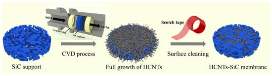 The preparation process for the ceramic SiC support was described in our previous work [43]. The porous SiC support was sandwiched with two graphite rings (in Figure 1) and placed into a stainless reactor consisting of concave and convex chimeric structures. The reactor was then placed into the heating furnace after checking air tightness. We prepared a 50 mL reaction solution by mixing ethanol and ferrocene at a concentration of 10 mg/mL and then added it into the injection pump, which was connected to the reactor inlet. Heating the reactor to a reaction temperature of 600 °C, we then injected the reaction solution at a speed of 1 mL/min into the reactor for 2 h under the protection of nitrogen. It then cooled to ambient temperature. The ceramic support was taken from the reactor, and the carbon material on the surface of the SiC support was stripped with scotch tape to obtain the HCNTs-SiC membrane material.