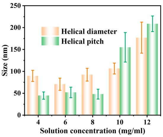 When the concentration of ferrocene/ethanol was 4 mg·mL−1, 6 mg·mL−1, and 8 mg·mL−1, the average pitch of HCNTs was 44.68 ± 8.3 nm, 51.91 ± 12.04 nm, and 47.99 ± 11.3 nm, respectively (Figure 5). This was due to the low concentration of the solution, generating the small catalyst particles, which induced the CNTs to twist with the small angle. At this time, the diameters of HCNTs were 89.72 ± 12.69 nm, 70.68 ± 13.91 nm, and 92.64 ± 14.59 nm, respectively. In addition, when the concentration increased to 10 mg·mL−1, the HCNTs’ pitch was 154.91 nm, and the helical structure became orderly (the helical diameter was 106.54 ± 12.42 nm). With the further increase of the concentration to 12 mg·mL−1, the pitch increased to 208.69 ± 17.83 nm, but few carbon nanotubes still retained the helix structure. The significant error bars of the helical diameter and pitch data indicated that the carbon materials prepared under the same conditions also had differences, further demonstrating that the particle size of the catalysts prepared by the chemical vapor deposition method was not so uniform. However, these results indicated that the pitch of HCNTs was positively correlated with the amount of ferrocene added, but the dissolution of ferrocene in ethanol tended to be saturated, and ferrocene was more likely to precipitate in the reactor to form large particles of catalyst, which was converted to Fe3C and formed straight carbon nanotubes.
