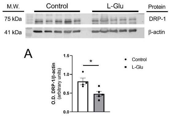 Firstly, it was observed that treatment with L-Glu significantly decreased the levels of dynamin-related protein 1 (DRP-1) in the fetal cerebellum. This protein is a GTPase that is currently considered the main regulator of mitochondrial fission [44]. It is initially located in the cytosol, and once it is activated through GTP hydrolysis, it oligomerizes around the outer mitochondrial membrane to initiate mitochondrial fragmentation and can ultimately trigger apoptosis [45]. It is not surprising, therefore, that an abnormal increase in this process is associated with the neuronal damage observed after acute or chronic damage to the Central Nervous System [46,47,48,49,50]. On the contrary, other studies have found a reduction in the levels of this protein obtained in heterozygote knock-out animals not generating mitochondrial deficiencies; however, mice showed a reduction in oxidative stress, reducing H2O2 and lipid peroxidation levels, not affecting synaptic viability [51]. Therefore, the reduction observed in the cerebellum from fetuses could indicate a possible protective mechanism to alleviate the oxidative stress in fetuses induced by mothers exposed to L-Glu, as published in previous work [11].