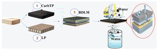 Figure 12. The membrane achieved excellent oil–water separation performance, attributed to the synergistic behavior of its structural components. During filtration tests, oils were efficiently separated due to the synergistic action of the hydrophilic longitudinal piece (LP), which facilitated rapid water transport through capillary action, and the superhydrophobic transverse piece (CarbTP), which effectively blocked and coalesced oil droplets.