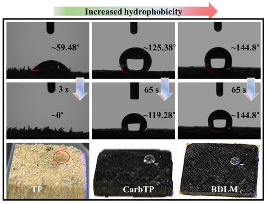 To address this limitation, the CarbTP was impregnated with hydrophobic polydimethylsiloxane (PDMS), filling its internal microchannels. This treatment significantly enhanced the hydrophobic properties of the transverse layer, achieving a water contact angle of approximately 144.8° (