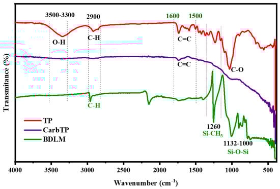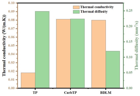Cp) also varies across the samples, rising from 0.694 J/(g·K) in the TP to 2.654 J/(g·K) in the CarbTP, and stabilizing at 0.729 J/(g·K) in the BDLM. These changes suggest a capacity for improved thermal energy storage, particularly in the carbonized form.