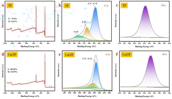 Figure 5d–f), the CarbTP sample shows significant compositional changes, with an increase in carbon content (89.45%) and a marked reduction in oxygen (10.55%). The C1s spectrum (