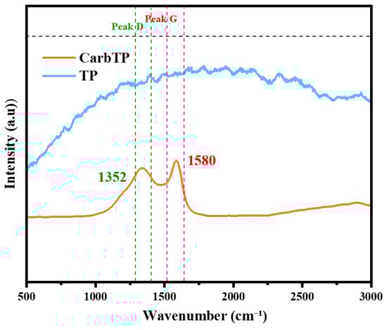 Figure 6 illustrates the Raman spectra of wood TP samples before and after carbonization (CarbTP—carbonized at 800 °C). Before carbonization, the spectra exhibit characteristic bands of the main organic components of wood, primarily lignin and cellulose. The peaks located around 1375 cm