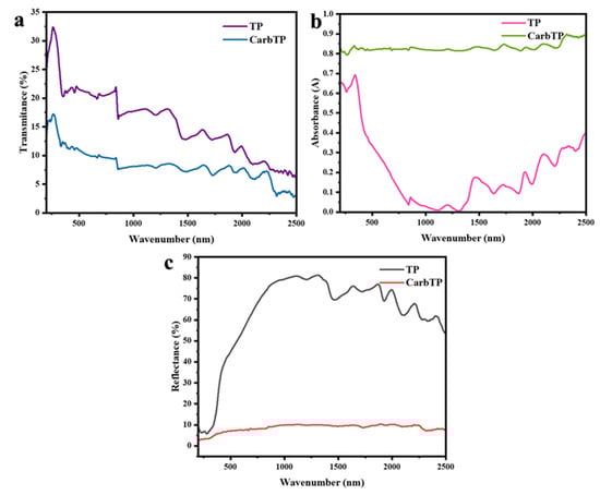 Figure 7a, the TP exhibits a relatively high transmittance of 21.06% in the visible spectrum (400–700 nm), attributed to its porous and hydrophilic structure, which promotes light transmission and reflection, facilitating efficient water transport and supporting oil–water separation. In contrast, the CarbTP demonstrates a significantly lower transmittance of 10.52% due to the formation of graphite domains during carbonization, enhancing light absorption and enabling effective light-to-heat conversion with an absorbance of 82.23% (