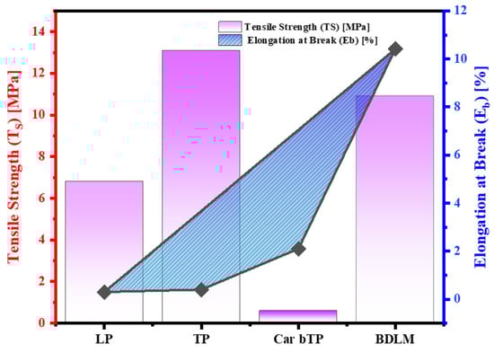 Figure 9 presents a comparison of the tensile strength and elongation at break of all specimens, demonstrating the mechanical anisotropy of the individual components (LP, TP, and CarbTP) and the synergistic properties of the BDLM. The BDLM shows intermediate tensile strength and high flexibility, combining the advantages of both layers.