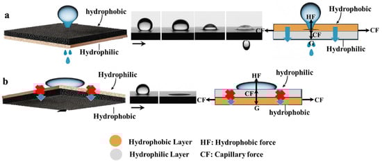 Figure 10a), HF initially resists penetration. However, as G increases, the droplet overcomes this barrier and moves through vertical microchannels to reach the hydrophilic layer, where the combined action of G and CF facilitates absorption and transport [