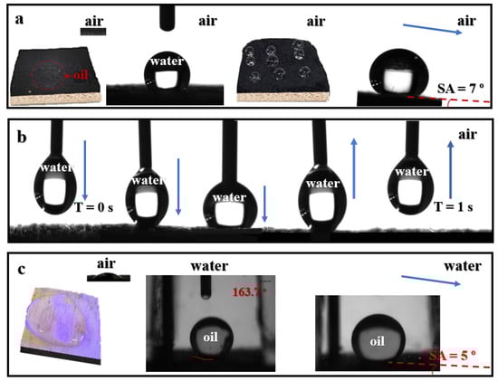 Figure 11a,b, the hydrophilic and underwater superoleophobic lower surface prevents oil contamination and clogging of the wood’s microchannels. Concurrently, the hydrophobic and superoleophilic upper surface ensures efficient oil management. This bifunctional design maximizes separation efficiency while maintaining membrane durability.