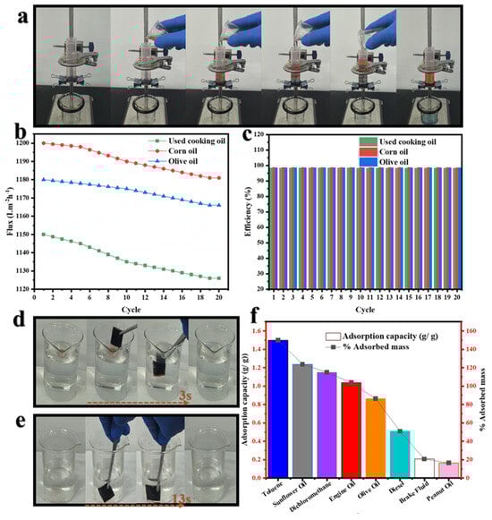 To evaluate the adsorption ability of the prepared membrane in the water–oil separation process, the following eight types of oils and organic solvents with varying polarities were assessed: toluene, dichloromethane, brake fluid, peanut oil, engine oil, diesel, olive oil, and sunflower oil. The results demonstrated rapid absorption of both floating (