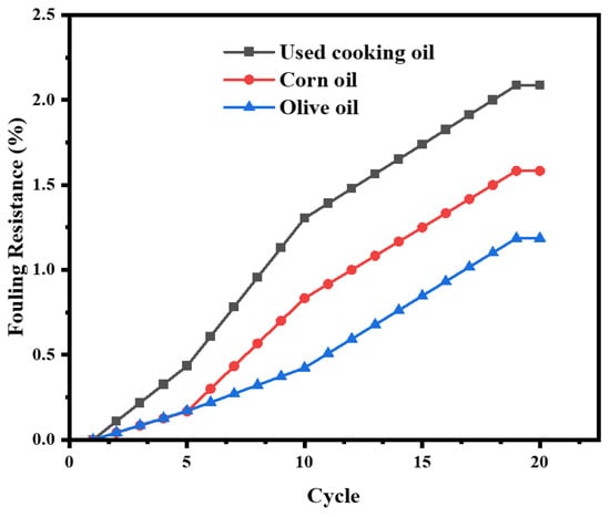RF)—defined as the flux loss due to irreversible membrane fouling—remained low, with maximum values of 2.09%, 1.58%, and 1.19% for used cooking oil, corn oil, and olive oil, respectively. Importantly, a simple rinse with an equimolar mixture of water and ethanol fully restored the membrane performance, effectively removing residual oil without leaving any deposits (