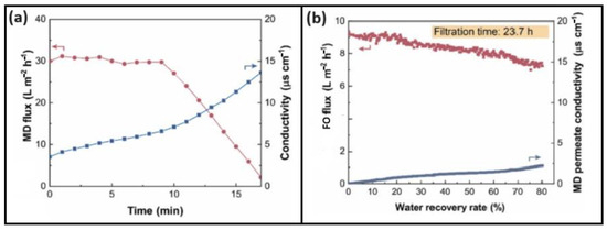 | FS: acid mine drainage. DS: 1 M NaCl. FO membrane: flat-sheet TFC membrane from Porifera, Inc. (USA). MD membrane: PTFE/PP flat sheet from Membrane Solutions (Shanghai, China). | FO FS temperature: 20–22 °C, DS temperature: 60 °C, FO initial flux: 23 LMH. After 12 h, FO flux was 64% of the initial value. MD feed temperature: 60 °C, distillate temperature: 20 °C, flux: 10.5 LMH with only a small decrease during 3.5 h of operation. 50% recovery was achieved [267]. |