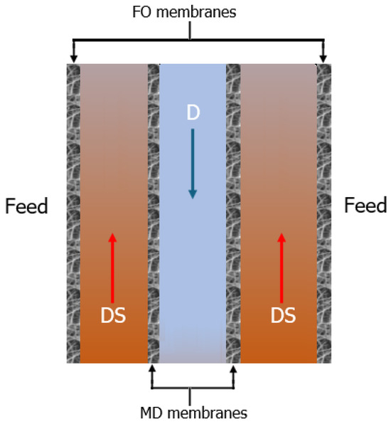 | FS: wastewater. DS: NaCl solution. FO membrane: commercial flat-sheet CTA membrane from HTI (USA). MD membrane: PVDF hollow fiber membrane. | FO DS concentration: 35 g/L, feed and DS CFV: 0.28 m/s. DS temperature: 53 °C, FS temperature: 20 °C. MD flux: 17.6 LMH, product water conductivity: 7.5 µS·cm−1. More than 90% removal efficiency of the contaminants (Cl−, NO3−, SO42−, PO43−, TOC, NH3-N, TN, and total phosphorus) was obtained [263]. |