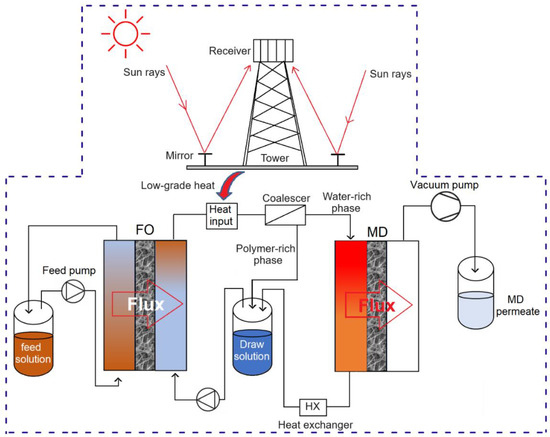| FS: oily wastewater. DS: 2 M NaCl. FO membrane: CTA-TFC membrane. MD membrane: PVDF hollow fiber. | FO FS temperature: 23 °C, DS temperature: 60 °C. FO flux: 20–32.5 LMH with oily wastewater (4000 ppm petroleum) as feed. MD feed temperature: 60 °C, MD flux: 5.8 LMH [123]. |