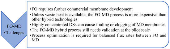 | FS: raw flue gas desulfurization wastewater. DS: 3 M NaCl. FO membrane: TFC polyamide membrane from Porifera, Inc. (San Leandro, CA, USA). MD membrane: PTFE supported by PP from Pall Gelman Sciences (Port Washington, NY, USA). | FO process CFV: 8.5 cm/s, temperature: 25 °C. FO process was carried out under the AL-FS mode. MD feed and permeate temperatures were 55 and 20 °C, respectively. At a 50% recovery rate, flux decreased from 18.5 to 13.1 LMH. Afterward, a sharp decrease in flux (13.1 to 2.8 LMH) was observed at 55% recovery. An organic removal rate of 98.61% was achieved [264]. |