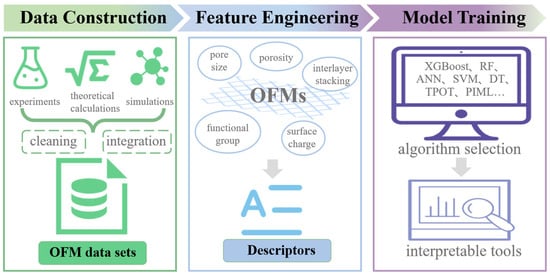 However, the design and optimization of OFMs face substantial challenges. Despite their theoretically near-infinite chemical space (e.g., over 100,000 experimentally synthesized MOFs [15]), traditional trial-and-error approaches and high-throughput computational screening (HTCS) suffer from high resource consumption and prolonged cycles when evaluating vast candidate libraries. While molecular simulations can predict performance metrics like permeability and selectivity, their computational complexity escalates exponentially with system size, hindering large-scale material exploration. This bottleneck highlights the critical need for data-driven approaches. With the emergence of the “fourth paradigm” of science—Data-Intensive Scientific Discovery [16]—machine learning (ML) has become a pivotal tool for accelerating OFM development [17,18]. ML excels at extracting hidden patterns from existing datasets to establish quantitative structure–property relationships (QSPRs), linking structural descriptors (e.g., pore geometry, functional group distribution) to separation performance [18,19]. This capability enables efficient candidate screening, inverse design guidance, and the seamless integration of simulation with experimental validation. For instance, ML models integrating experimental data, molecular simulations, and theoretical databases can construct multidimensional feature systems, unveil intricate structure–performance correlations, and achieve cross-domain optimization across scenarios such as gas separation [20] and water treatment.