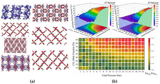 (a) The atomistic structures of top-performing metal–organic framework (MOF) membranes: CARGEI, YUJWAD, RIPWEU, VEHNED, WOCJII, YUJWOR, and YUJWUX (the order is from top left, to bottom left, to top right, and finally to bottom right). Reproduced from [35] with Open Access; (b) EaCH4/EaCO2 values exhibit periodic fluctuations rather than smooth variations (e.g., 3.2 at 90% CO2 and 4 atm), likely due to hindered CH4 diffusion under high CO2 concentrations (90%), which amplifies chaotic effects in molecular dynamics (MD) simulations and causes fluctuations in the diffusion coefficient. Reproduced from [25] with Open Access.