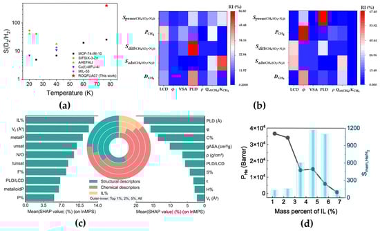 (a) A comparative study of D2/H2 separation selectivity between ROQFUA07 and other MOF materials. Reprinted with copyright permission from Ref. [39] Copyright 2019 Elsevier B.V.; (b) relative importance values of the seven descriptors predicted by the RF algorithm for CH4/O2 + N2 (left) and H2/O2 + N2 (right). Reproduced from [40] with Open Access; (c) the descriptor importance for lnMPS, comparing the top 1% IL@APMOF set (left bar chart) with the entire IL@APMOF set (right bar chart). The SHAP values are listed on the horizontal axis. The circular diagrams show the distribution and relative importance of structural descriptors (green), chemical descriptors (red), and the ionic liquid content (IL%) (yellow) across various datasets, progressing inward from the outer circle (representing the top 1% IL@APMOFs) to the top 2%, top 5%, and the entire IL@APMOF dataset. Reprinted with copyright permission from Ref. [50] Copyright 2025 Elsevier B.V.; (d) the relationship between the IL mass percent and the performance metrics of the IL@APMOF composite membrane, including He permeability and membrane selectivity. Reprinted with copyright permission from Ref. [50] Copyright 2025 Elsevier B.V.