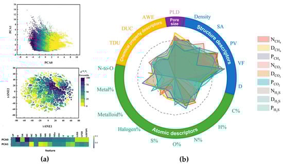 (a) Unsupervised learning implemented for classification of adsorption selectivity. Classification results from principal component analysis (PCA) algorithm (top), with color mapping representing the adsorption selectivity percentage and the horizontal and vertical axes representing two principal components, and the T-SNE algorithm (bottom). Weighting map of the descriptors corresponding to the two principal components in the PCA, with color mapping from darker to lighter indicating stronger correlation. Reprinted with copyright permission from Ref. [52] Copyright 2024 American Institute of Chemical Engineers; (b) radar plots of feature importance for the gas adsorption, diffusion, and permeability of covalent organic frameworks (COFs). The SHAP values for each type of explainer have been normalized, and the scale range shows a Log distribution from 0.01 to 1. Reprinted with copyright permission from Ref. [41] Copyright 2024 American Chemical Society.