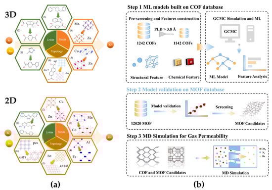 (a) Design strategies of 3D and 2D MOF membranes for boosting Kr/Xe separation. Reprinted with copyright permission from Ref. [54] Copyright 2019 Elsevier Ltd.; (b) a workflow for developing universal machine learning models to screen high-performance COFs/MOFs membrane materials for helium separation. Reprinted with copyright permission from Ref. [42] Copyright 2024 Elsevier Ltd.
