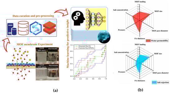 (a) An in situ fabrication of a hierarchical PDA-stabilized UiO-66-NH2 membrane with machine learning-optimized oil/water separation performance. Reprinted with copyright permission from Ref. [55] Copyright 2024 American Chemical Society; (b) the relative importance of input variables for membrane performance: water permeability and salt rejection. Reprinted with copyright permission from Ref. [56] Copyright 2024 Elsevier Ltd.