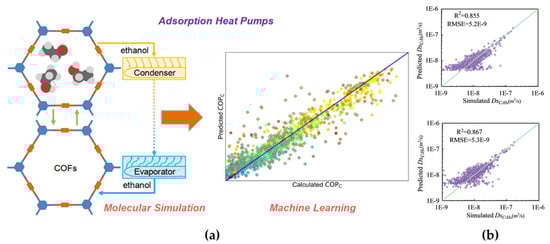 (a) The computational and machine learning approach for evaluating COFs in ethanol-based adsorption heat pumps. Reprinted with copyright permission from Ref. [61] Copyright 2020 American Chemical Society; (b) regression models for predicting the diffusion coefficients C3H8 (top) and C3H6 (bottom). Reprinted with copyright permission from Ref. [58] Copyright 2025 Elsevier Ltd.