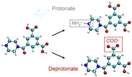 The main focus of this work is to investigate how differences in the membrane charge state affect solute transport, but it is quite difficult and computationally expensive to model the dynamic process of amine group protonation and carboxyl group deprotonation. Instead, we construct membranes with pre-defined ionization states for the solute transport simulations. In our previous work [49], we constructed negatively charged membranes by removing hydrogen atoms from selected carboxyl groups (R–COOH) to form R–. The number of deprotonated carboxyl groups depends on how far the feed pH is above the isoelectric point (IEP), as discussed in later sections. Here, we also construct positively charged membranes, where the number of amine groups (R–NH) that are protonated to R–NH depends on how far the feed pH is below the IEP. Protonated and deprotonated dimers are shown on the right in Figure 1. The general AMBER force field (GAFF) [50] is used to describe the forcefields for NH, and AM1-BCC in AmberTools18 [51,52] is utilized to determine the topology and partial charges of ionized amine groups. Other simulation parameters are similar to those in our previous work [49].