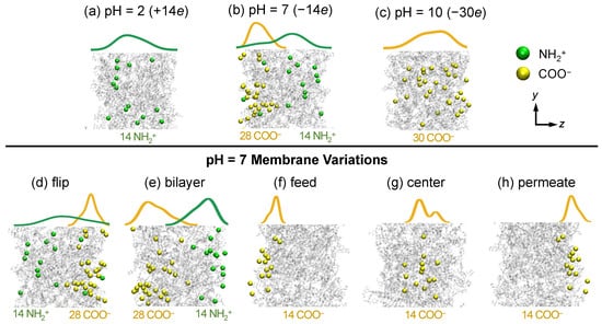 Membrane models at various pH conditions reflecting the membrane’s net charge. (a) pH = 2 (+14e), (b) pH = 7 (−14e), and (c) pH = 10 (−30e), and (d–h) pH = 7 with membrane net charge of −14e. Carboxylate and ionized amine groups are represented as yellow and green beads in the membrane model representations, respectively. Charged groups are shown in the yz-plane but are actually distributed in the x-direction as well. The distribution of charged groups through the thickness of the membrane is indicated qualitatively just above each membrane model (yellow curves for and green curves for NH).