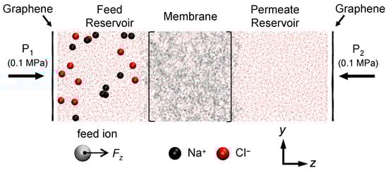 To explore the intricate interplay between charged solute behavior and membrane charge, both NaCl and are used as the solutes. This allows for the examination of both monovalent and divalent cations and their interactions with the charged membranes. The solute transport system that we simulate is shown in Figure 4. The system comprises one of the membrane models shown in Figure 3 with reservoirs on either side of the membrane having the same size (5.2 × 5.2 × ) and matching the dimensions of the membrane in the x- and y-directions with periodic boundary conditions. A single-layer graphene sheet is positioned on the outside of each reservoir on which external pressure of 0.1 MPa is applied, resulting in zero transmembrane pressure. In addition to the water molecules already present in the membrane during hydration and equilibration, the feed and permeate reservoirs are filled with 3918 water molecules packed at 1 g . The water reservoirs and graphene sheets are equilibrated for 10 ns and the entire system undergoes a minimization process before production runs. Since our focus is on comparing monovalent versus divalent cation transport, we use the same concentrations of and ions. In the feed reservoir, there are either and or and , with the original counter-ions used to equilibrate the membrane remaining in the simulation to balance the charge. Given the size of the feed reservoir, this particular number of solute ions is equivalent to 0.133 M NaCl or solution. In the permeate reservoir, only water molecules are present initially. The counter-ions added during the equilibration process are initially in vicinity of membrane charges; however, they can move freely during simulations. After a typical 100 ns simulation, most counter-ions remain within 5 Å of the membrane charged groups.