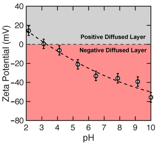 Zeta potential as a function of solution pH for NF270. A 0.1 M KCl solution is used as the electrolyte stream, and the zeta potentials (circles) are calculated from the streaming potential with the Smoluchowski equation [67,68]. The dashed curve is based on a second-order polynomial interpolation. The error bars are standard deviations from triplicate measurements.