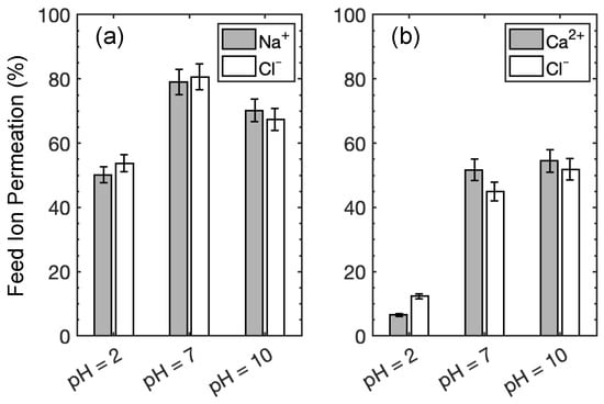 Feed ion permeation as a function of solution pH for (a) NaCl and (b) . The error bars are standard deviations from triplicate measurements.