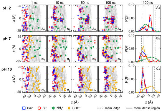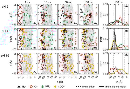 To elucidate the molecular level transport behavior of solute ions, we consider 0.133 M NaCl and 0.133 M solutions at three pH levels (pH = 2, 7 and 10) across three trials. The feed ion locations are depicted in the xz-plane at four time instances after starting in the reservoir on the feed side of the membrane, as shown in the first four columns in Figure 7 and Figure 8. In order to clearly indicate ions that have permeated completely through the membrane, we reset the z-locations for any ions with z > 40 Å to z = 40 Å. The gray shading in the first four columns indicates the local density of the membrane model, with darker gray corresponding to higher density. Ion and charged end group locations are projected onto the xz-plane, although they are at varying positions in the depthwise y-direction. Note that the positions of the charged end groups may shift slightly in position from one time instant to another. This is a consequence of the natural motion of the membrane nanostructure due to thermal vibrations and collisions with water molecules [37]. Also note that the vertical x-axis is stretched compared to the horizontal z-axis to more clearly show the distribution of ions and charged end groups. The last columns in Figure 7 and Figure 8 show the probability density function (PDF) of feed ion and membrane functional group z-locations at 100 ns based on a default Matlab kernel smoothing function (we used 50% of default bandwidth for and 80% for the cations’ default bandwidths) [72,73,74,75].