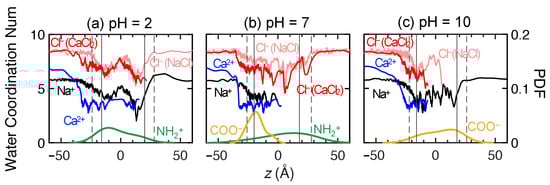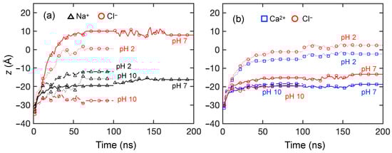 The and ions exhibit different behaviors at each pH level. For pH = 2 and 7, ions advance into the membranes faster, as indicated by the steep slope for the z-locations, and much further on average than ions. On the other hand, the average penetration of ions into the membrane is more limited, although the distributions of the ions in the membrane at steady state are much broader at pH = 2 and 10 than at pH = 7, as is evident in Figure 7. The net result is that the average z-locations for and ions at the end of the simulation differ substantially. This suggests that –NH attraction plays a significant role of assisting movement during the transport process for the first 30–40 ns. A very different situation occurs for pH = 10, where ions penetrate further and faster into the membrane than ions. Here the groups are positioned deeper in the membrane. They attract the ions but repel the ions. Unlike at the lower pH levels, there are no –NH interactions to draw ions into the membrane.