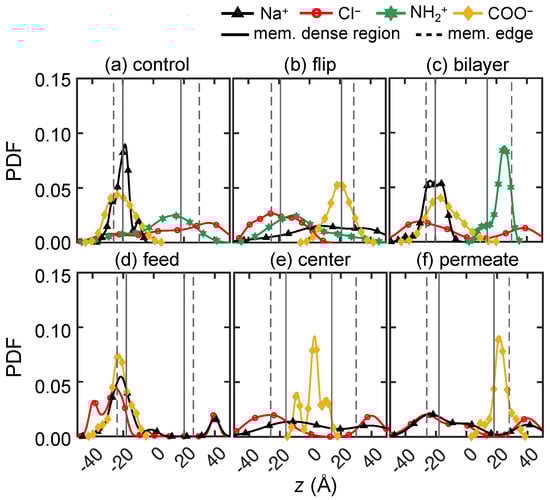 The phenomenon of a feed surface layer of trapping ions also occurs for the “bilayer” (Figure 10c) and “feed” (Figure 10d) charge distributions. When groups are distributed elsewhere, such as in the membrane “center” or toward the “permeate” reservoir (Figure 10e,f, respectively), some ions permeate through the membrane, and ions are less likely to get stuck on the membrane surface. Interestingly, the bilayer case and the feed case yield very different results even though both have a high concentration of near the feed surface. In the bilayer case, the attraction between groups and ions seems to trap the ions near the feed surface, while ions pass through the membrane, aided by the collective electrostatic attraction of the NH groups on the permeate side of the membrane. In the feed case, ions are trapped near the groups, but ions are also trapped in the same vicinity. Curiously, a small number of and ions permeate through the entire membrane. It is difficult, however, to draw general conclusions because of the presence of NH in some cases and the difference in the overall number of groups in the different cases (28 vs. groups in the “bilayer” and “feed” membrane models, respectively). Moreover, when local density of groups is higher on the surface in the feed case, – clusters appear to form on the membrane surface, which may induce steric repulsion to further block pathways for other ions to pass through. Lastly, NH and groups have different impacts on transport. When NH is present, a peak in the distribution is associated with where NH is concentrated (Figure 10a–c). When NH is not present (Figure 10d–f), tends to associate with its counter-ion, .