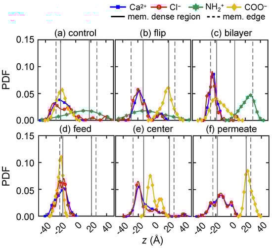 The probability density function of feed ions and membrane functional groups ( and NH) in the z direction at t = 100 ns using 6 variations of membrane models, each with a net charge of −14e but with different charge distributions defined in Figure 3: (a) control, (b) flip, (c) bilayer, (d) feed, (e) center, and (f) permeate. Symbols on the distribution curves are merely to identify the curve; they do not represent individual data points. Dashed lines mark the edge-to-edge boundaries of the membrane model, and solid lines bound the densest regions of the membrane. , , NH, and are indicated by black triangles, red circles, green stars, and yellow diamonds, respectively.
