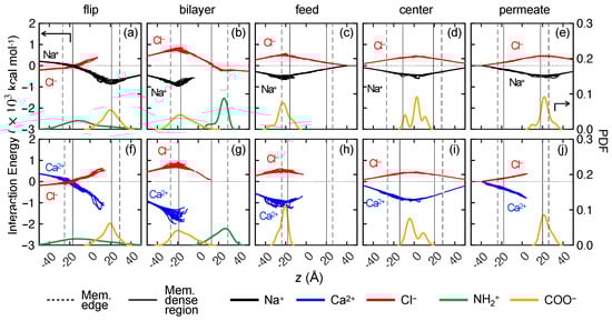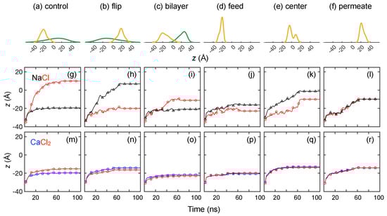 We have shown previously that a feed solution results in few events where ions permeate entirely through the membrane. Not surprisingly, the results are similar for the other five membrane variations in Figure 11b–f. That is, a majority of the and ions get stuck near the feed surface of the membrane and remain there throughout the entire simulation, regardless of the way charges are distributed in the membrane. This indicates a steric mechanism that prevents ion transport. This also corroborates the idea that the strong association between and ions leads to clusters, which may also lead to steric effects that reduce the transport of both ions.