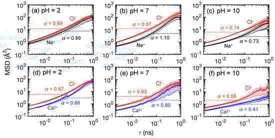 Based on the results in Figure 7 and Figure 8, different transport behaviors are evident for monovalent cations () and divalent cations (), which also affect the monovalent anions (). In general, transits the membrane more easily than . It appears that is less strongly associated with , evident as less overlap in the and distributions, hence experiencing less the steric repulsion. To confirm this, we measure the ensemble average ion pair maximum lifetime for both feed solutions, which is based on consecutive time steps that a pair of ions are within 5 Å [80] of each other. For –, the ion pair lifetimes are 4.3 ns, 1.9 ns, and 9.0 ns at pH = 2, 7, and 10, respectively. On the other hand, the ion pair lifetimes for – are an order of magnitude longer at 73.6 ns, 99.0 ns, and 98.9 ns for at pH = 2, 7, and 10. It seems likely that the strong association between and ions leads to the formation of – ion clusters, the sizes of which are greater than the average pore size of the membrane (about 5.6 Å). Hence, steric repulsion may play an important role of slowing solute transport for feed solutions. Of course, the number of ions that are available is smaller for NaCl than for , which may also play a role. Regardless, ions are still attracted to ions, resulting in being transported more easily than via chaperoning through the membrane. Of course, during the nanosecond scale of our simulations, the chaperoning effect is in competition with membrane charge interactions. Cation transport is hindered when groups are present due to attractive electrostatic interactions. The hindrance effect is most pronounced when groups are concentrated on membrane surface at pH = 7. On the other hand, ions seem to be able to traverse the membrane via hopping from one NH to another when NH groups are spread out within a membrane at pH = 2 or pH = 7, but transport is hindered at pH = 10 due to the lack of NH groups.