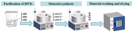 A schematic diagram of the steps for preparing HNTs@ZIF-67 is shown in Figure 1. The synthesis steps of HNTs@ZIF-67 were as follows: (1) Purification of HNTs. An appropriate amount of HNT powder was placed in deionized water and sonicated for 1 h. Then the purified HNTs were separated by centrifugation and placed in an oven at 100 °C for 24 h to obtain dry purified HNTs. (2) Material synthesis. A total of 80 mg of purified HNTs was added to ethanol and sonicated for 30 min to obtain a uniformly dispersed HNT suspension. Then, 1.28 g dimethylimidazole and 0.08 g cobalt nitrate hexahydrate were dispersed in 10 mL ethanol. Next, the HNT suspension was heated, and the dimethylimidazole solution and cobalt nitrate hexahydrate solution were rapidly added until the temperature reached 80 °C; then the mixture was stirred violently for 10 min to obtain an HNTs@ZIF-67 suspension. (3) Material washing and drying—The HNTs@ZIF-67 suspension was centrifuged at 3000 rpm, and the obtained lower layer precipitate was washed with ethanol 3 times. Finally, the washed precipitate was dried under vacuum conditions at 85 °C to obtain HNTs@ZIF-67 powder.
