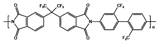 At present, the separation of helium (He) and methane (CH4) usually uses polyimide membranes (such as Matrimid 5218) and microporous polymer membranes (such as PIMs) [6,7,8]. However, these polymer structures typically struggle to have high He permeability and high He/CH4 selectivity simultaneously. Matrimid 5218 possesses a high degree of chain packing density and has limited chain mobility, which makes its He/CH4 selectivity as high as 130, but its helium permeability is only 23 Barrer [8,9]. Although PIMs have large free volumes and high permeability, the large chain mobility also leads to poor long-term stability and low selectivity, which limits their industrial application. It has been reported that the polyimide membranes of 4,4′-(Hexafluoroisopropylidene) diphthalic anhydride(6FDA) and 2,2′-bis(trifluoromethyl) benzidine (TFMB) exhibit excellent He/CH4 separation ability. There are a large number of trifluoromethyl (-CF3) groups in the side chain of 6FDA-TFMB, which reduces the chain stacking and increases the free volume; both effects synergistically improve the permeability of helium. Moreover -CF3 can also inhibit chain rotation and migration, which hinders the diffusion of CH4 and enhances the selectivity of He/CH4 [7]. In addition, 6FDA-TFMB has good thermal stability and mechanical properties, showing industrial application potential. However, 6FDA-TFMB as a polymer membrane still has a trade-off effect between permeability and selectivity, which limits the further improvement of membrane performance.