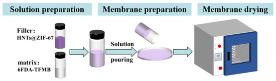 The preparation steps of HNTs@ZIF-67/6FDA-TFMB MMMs are as follows (1) Solution preparation—The HNTs@ZIF-67 fillers and matrix 6FDA-TFMB (structure shown in Figure 2) were, respectively, vacuum dried at 85 °C and 150 °C for 12 h to remove excess residual organic solvents and water. Then, 0.2 g 6FDA-TFMB was dissolved in anhydrous DMAC to prepare a 10 wt% solution, and then different proportions of dried HNTs@ZIF-67 were added in anhydrous DMAC and sonicated to achieve uniform dispersion. (2) Membrane preparation. A 10 wt% 6FDA-TFMB solution was poured into an HNTs@ZIF-67 solution and stirred for 24 h to obtain the casting solution. The stirred casting solution was sonicated for 6 h to defoam it, and then the casting solution was decanted into a glass Petri dish. (3) Membrane drying. The Petri dishes with the casting solution were put in an oven at 55 °C for 12 h, 85 °C for 6 h, and 120 °C for 6 h, respectively, and finally, they were put in a vacuum oven at 150 °C for 12 h to obtain MMMs. The Schematic diagram of the preparation process of MMMs is shown in Figure 3.