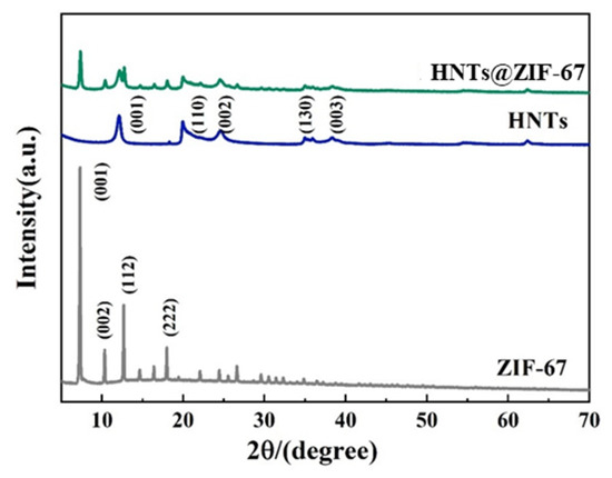 The structure of HNTs@ZIF-67 composites was analyzed by X-ray diffraction (XRD). The XRD results of HNTs@ZIF-67 composites are shown in Figure 4. The XRD data of HNTs show diffraction peaks at 12.11°, 20.07°, and 24.57°. These diffraction peaks can also be found in the XRD pattern of HNTs@ZIF-67. The XRD data of ZIF-67 showed sharp diffraction peaks at 2θ = 5.36° and 12.48°, which also appeared in the XRD data of HNTs@ZIF-67. The above results show that the diffraction peaks of HNTs and ZIF-67 appear in HNTs@ZIF-67 at the same time, indicating that ZIF-67 has successfully been introduced into HNTs and grown on them, without destroying their crystal structure.