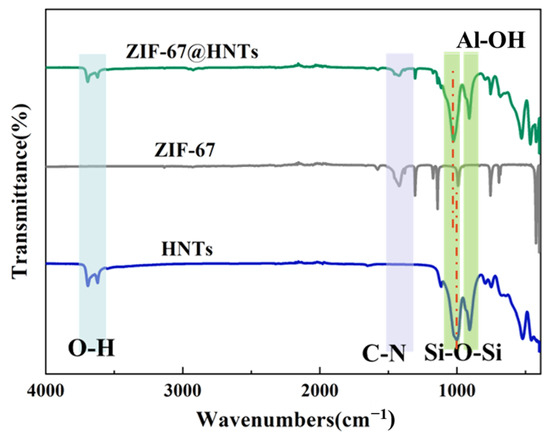 Fourier transform infrared spectroscopy (FTIR) was used to explore the molecular structure and chemical composition of the synthesized HNTs@ZIF-67. The FTIR data of ZIF-67, HNTs@ZIF-67 and HNTs are shown in Figure 5. In the FTIR spectrum of HNTs, the peaks at 3610 cm−1 and 3640 cm−1 corresponded to -OH [25,26]. In addition, the characteristic peaks at 1031 cm−1 and 908 cm−1 in the original HNT spectrum, were attributed to the tensile vibration of Si–O–Si and the bending vibration of Al-OH, respectively [27]. The peak at 470 cm−1 represents the bending vibration of the Si–O bond. The peak at about 1250 cm−1 in ZIF-67 is associated with the stretching vibration of the C–N bond in dimethylimidazole [28,29]. The above unique peaks of HNTs and ZIF-67 all appeared in the spectra of HNTs@ZIF-67, indicating that ZIF-67 was successfully introduced into HNTs. It can be found that the intensities of the -OH peak at 3610 cm−1 and 3640 cm−1 and the Al-OH peak at 908 cm−1 are weakened; it can thus be speculated that -OH provided the growth site for ZIF-67 and was covered by ZIF-67. The intensity of the Si–O–Si peak near 1031 cm−1 is also reduced and a blue shift can be observed on it; it can thus be speculated that the strong interaction between Co or imidazole groups in ZIF-67 and Si–O–Si in HNTs caused the successful preparation of HNTs@ZIF-67.