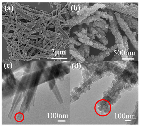SEM and TEM images of (a,c) HNTs and (b,d) HNTs@ZIF-67.