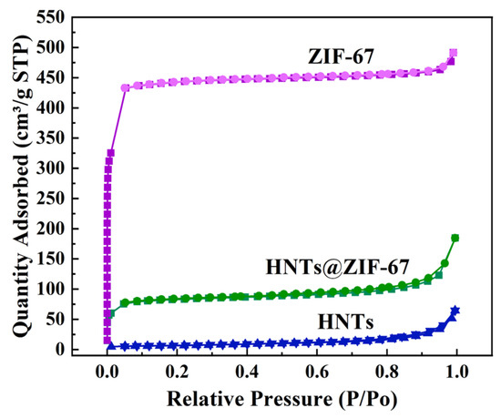 To explore the pore structure of HNTs, ZIF-67, and HNTs@ZIF-67, a N2 adsorption–desorption test was carried out. The results are shown in Figure 7. The adsorption–desorption curve of the original HNTs shows the H3 hysteresis loop and conforms to the type IV isotherm, indicating that the HNTs have a mesoporous structure [29]. The adsorption–desorption curve of the original ZIF-67 shows the type I isotherm, indicating that the ZIF-67 has a microporous structure [30]. The adsorption and desorption curve of HNTs@ZIF-67 showed an H3 hysteresis loop composite I/IV isotherm. The N2 adsorption–desorption process of HNTs@ZIF-67 is mainly divided into three stages: P/Po < 0.02, 0.02 < P/Po < 0.85, and P/Po > 0.85. When P/Po < 0.02, the N2 adsorption capacity of HNTs@ZIF-67 began to increase, indicating that ZIF-67 had a microporous structure. When P/Po > 0.85, the N2 adsorption capacity also increased sharply, and an obvious hysteresis loop appeared, which may be because of the mesoporous structure of HNTs. The above results indicate that HNTs@ZIF-67 is successfully prepared and constitutes a composite material with both microporous and mesoporous structures.