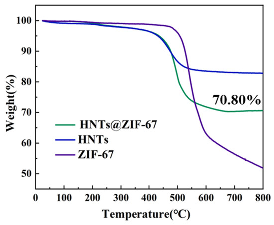 To explore the thermal stability of HNTs@ZIF-67, a thermogravimetric analyzer (TGA) was used, and the weight loss curve is shown in Figure 8. In the range of 0~200 °C, HNTs and HNTs@ZIF-67 showed a slight mass loss, which can likely be attributed to the residual water within HNTs@ZIF-67. At about 425 °C, HNTs and HNTs@ZIF-67 began to show significant mass loss, and ZIF-67 began to degrade at 500 °C. The mass loss of HNTs around 425 °C is mainly attributed to the structural degradation of HNTs [33]. The weight loss of HNTs@ZIF-67 at 425~650 °C can be attributed to the structural degradation of HNTs and the gradual pyrolysis of organic ligands of ZIF-67. HNTs@ZIF-67 has a thermal stability comparable to that of HNTs, and the initial pyrolysis temperature is about 425 °C. The residual rate of HNTs@ZIF-67 was 70.8%. According to the mass ratio of HNTs to ZIF-67 in the experiment, the theoretical residual [34,35] of HNTs@ZIF-67 was calculated according to Equation (S1), and the calculated results are listed in Table 1. It can be found that the experimental residual mass is slightly larger than the theoretical residual mass. Indicating that the interaction between HNTs and ZIF-67 improved the stability of the HNTs@ZIF-67, once again indicating that ZIF-67 successfully grew on HNTs, indicating that the interaction between HNTs and ZIF-67 improved the stability of HNTs @ ZIF-67 within P/Po < 0.02 was reduced by about 75% compared with pure ZIF-67. This may be caused by the following two reasons. First, HNTs in HNTs@ZIF-67 have no contribution to micropore adsorption, which leads to a decrease in adsorption capacity. On the other hand, the results of the infrared test show that there is an interaction between HNTs and ZIF-67, which may lead to a decrease in the pore size of ZIF-67 on the near side of HNTs, making it difficult to adsorb N2 and leading to a decrease in adsorption capacity.