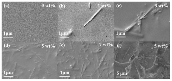 Surface and cross-section electron microscopy of different loadings: (a) 0 wt%, (b) 1 wt%, (c) 3 wt%, (d) 5 wt%, (e) 7 wt%, and (f) cross-section images of 5 wt% MMMs.