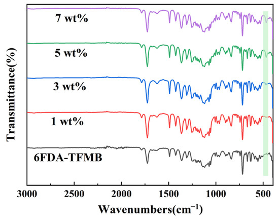 The FTIR of HNTs@ZIF-67/6FDA-TFMB MMMs with different loadings is shown in Figure 10. The FTIR spectra of the MMMs were basically similar to those of the pure 6FDA-TFMB membranes. However, a novel absorption peak showed up at 470 cm−1, which is associated with the bending vibration of the Si–O bond [26], and the peak intensity increased with the increase in the loading amount of HNTs@ZIF-67, which again indicated that HNTs@ZIF-67 was successfully introduced into MMMs.