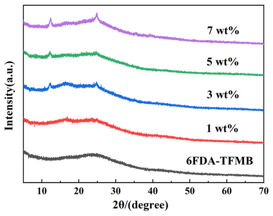XRD spectra of MMMs with different loadings of HNTs@ZIF-67/6FDA-TFMB.