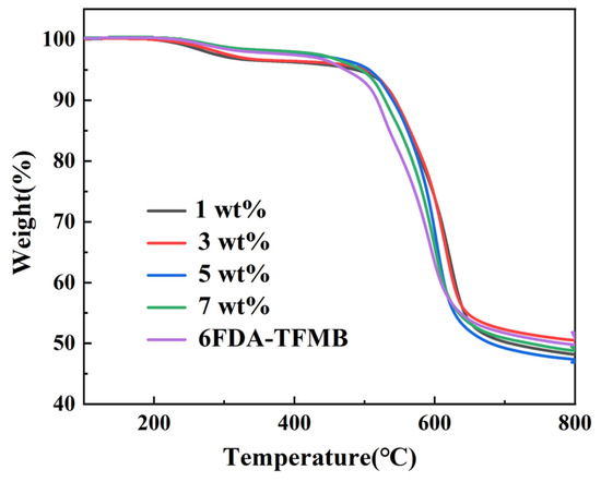 TGA result of MMMs with different loadings of HNTs@ZIF-67/6FDA-TFMB.