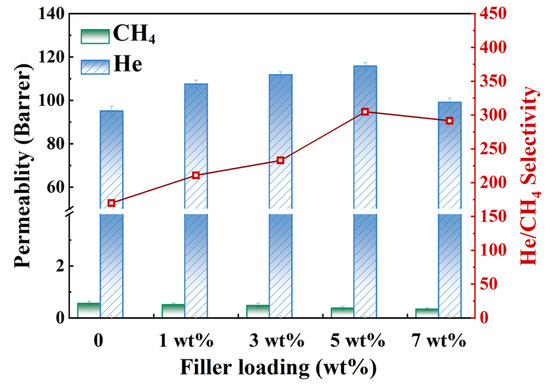 In this work, high purity He and CH4 were utilized as test gases to explore the gas permeability of MMMs. The gas permeability test of MMMs with different doping amounts was carried out at 35 °C and 0.2 MPa. It can be seen from Figure 13 that the introduction of HNTs@ZIF-67 makes the He permeability of the MMMs increase first and then decrease, and the selectivity and He permeability show the same trend. When the loading of the HNTs@ZIF-67 composite was 5 wt%, the permeability of He reached about 116 Barrer, which was 22.11% higher than that of the 6FDA-TFMB membrane, and the selectivity of He/CH4 reached about 305, which was 79.41% higher than that of the 6FDA-TFMB membrane. As the doping amount continues to increase when the loading amount reaches 7%, some fillers begin to stack, resulting in uneven dispersion of the filler, making it difficult for the hollow structure to effectively promote He diffusion in the membrane, and finally causing a decrease in He/CH4 selectivity.